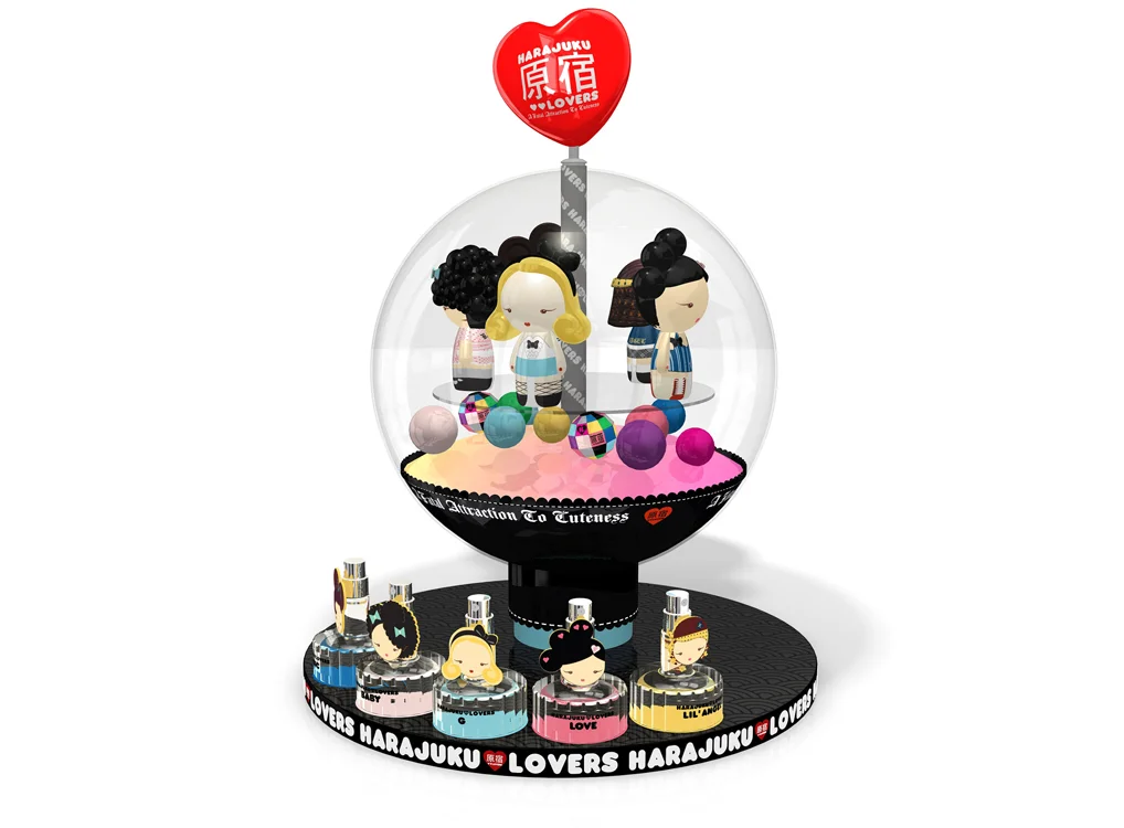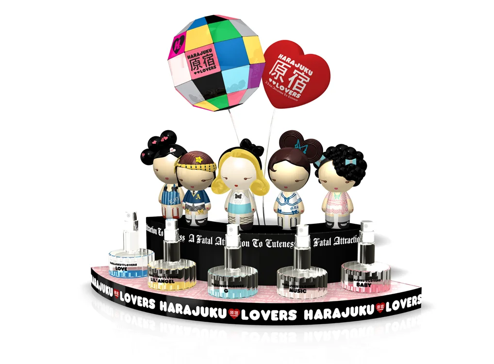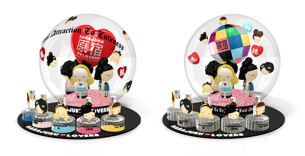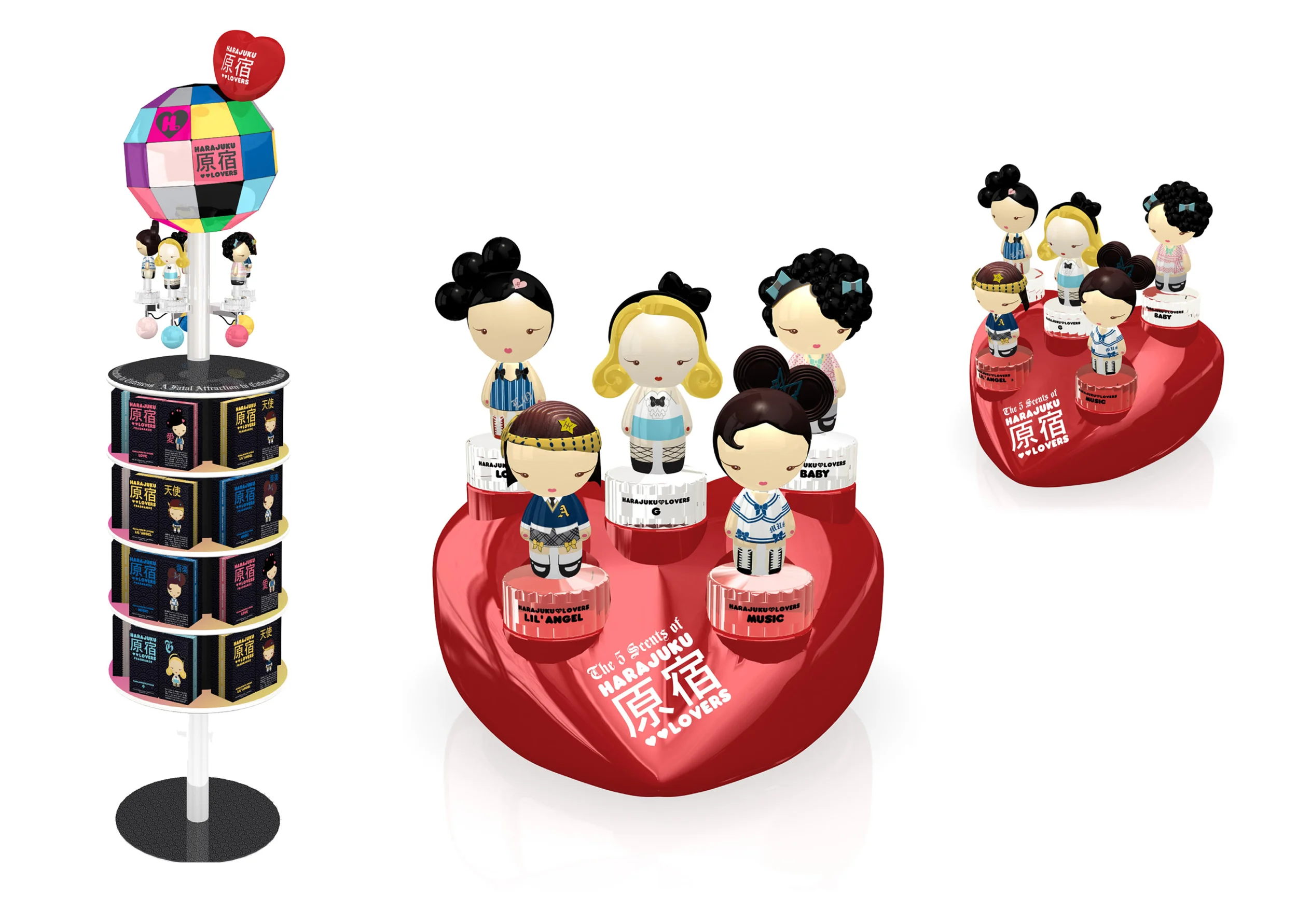 Executed overall merchandising design for fragrance launch of Gwen Stefani’s brand, Harajuku Lovers, as part of a team at design agency, RPG. The playful and interactive system helped create a strong competitive advantage and rang true to the brand’s tag line, “A Fatal Attraction To Cuteness.” 3D Render: RPG